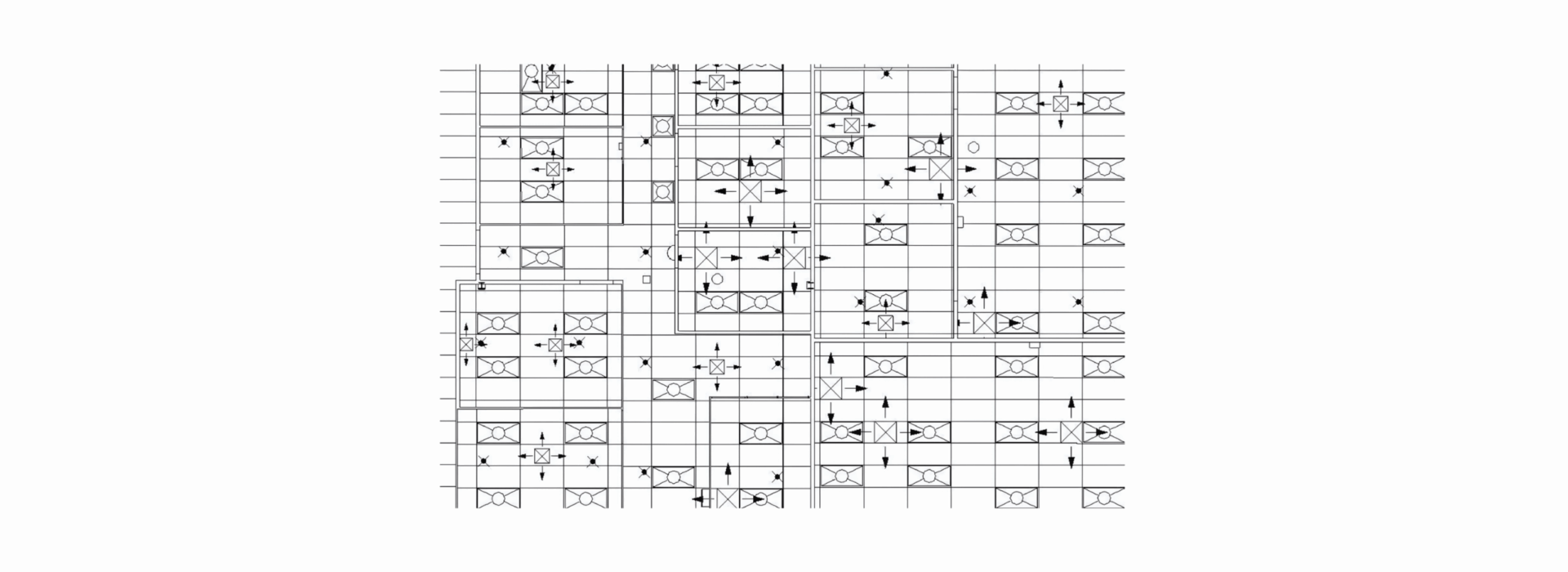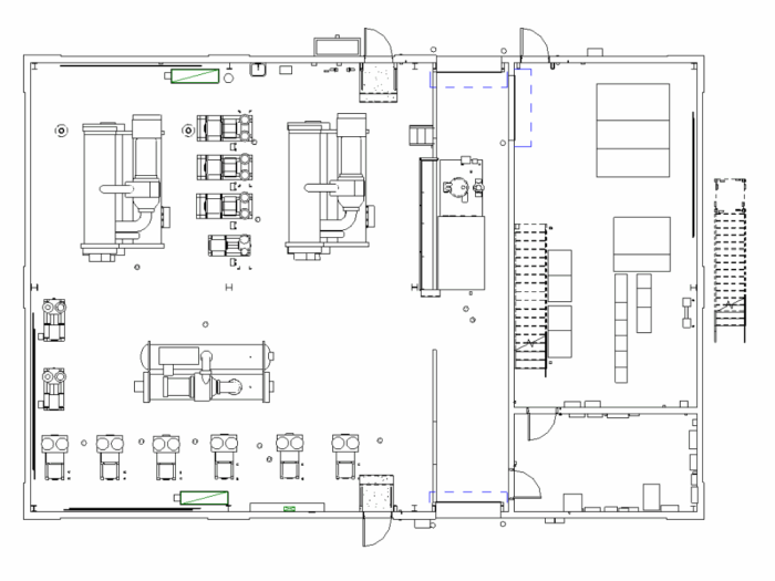 Layouts that detail major equipment placements, mechanical clearances, or fixture positioning to support efficient facility planning.